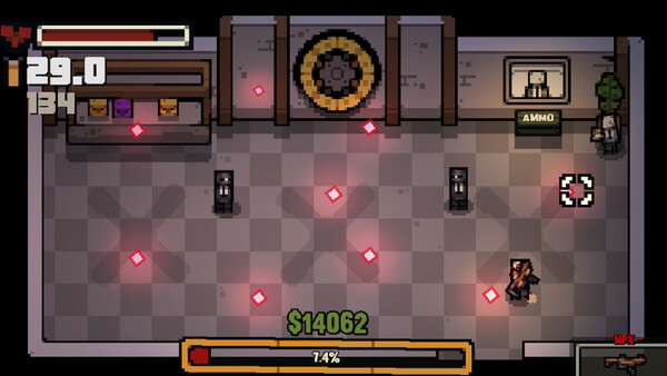 Battle through 5 dangerous areas! From smuggling yards and gambling dens to high security vaults. Each location contains unique enemies, hazards, and bosses. Levels are semi-randomized, with handcrafted rooms arranged differently every run for endless replay-ability.
