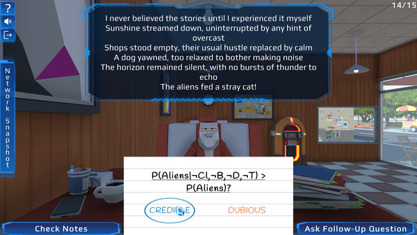 Celestial Anomalies is a 2-5 hour paranormal investigation game where you use machine learning tools to separate fact from fiction. Interview eccentric townsfolk, weigh their testimonies, and use a Bayesian belief network to uncover how even tiny clues can tip the scales between truth and fabrication. Piece by piece, you’ll learn to reason under uncertainty and answer the question: are the aliens friendly, hostile, or just a story after all? Uncovering the truth could change the way humanity sees the universe, and how two people see each other.