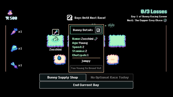 With only a brief period of time before your bunnies are too old to race and retire, you have to budget carefully for different types of food that will raise one of a bunny's three stats. Do you focus on stamina so they can sprint for longer, or go all in on speed - or do you give them more chutzpah, allowing for a bigger boost to their speed when they sprint? Will you go for a balanced approach, or a targeted one?