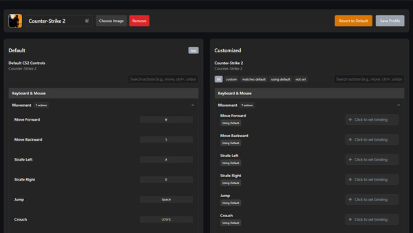 Side-by-Side Comparison - Compare custom vs default bindings