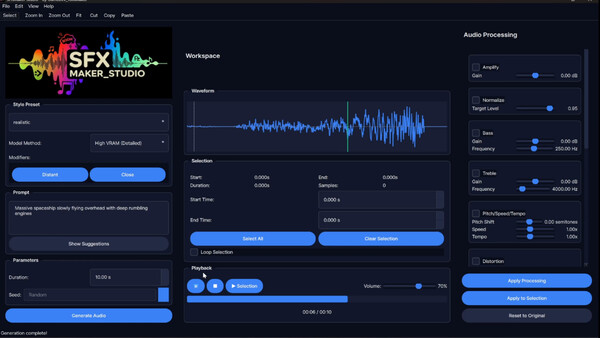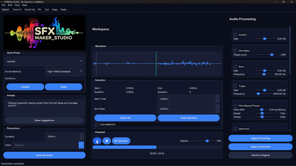 Professional Audio Editor: Fine-tune your generated sounds with a comprehensive suite of editing tools including multi-track mixing, effects processing, and real-time preview