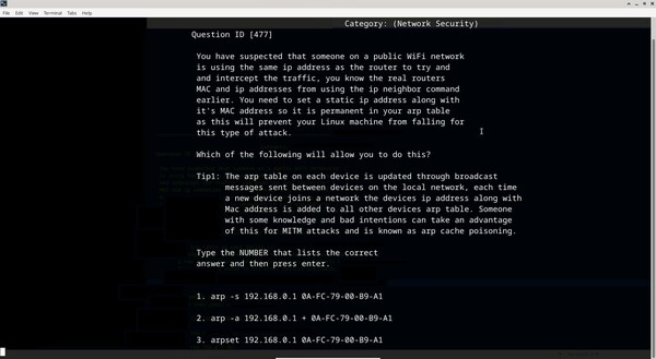 100 questions are randomly outputted from a larger database each run, the user is presented with three possible answers for each question with only one being the correct one, the user must then choose the correct one by typing the actual correct SYNTAX (the SYNTAX can also be copied and pasted to answer, this can be useful if the user is already familiar with a particular SYNTAX and does not wish to type it) that would be used in the real Bash terminal, because it's run in a terminal it gives an authentic feel to the real thing and users can remember the syntax overtime and use it within their own Linux installation.